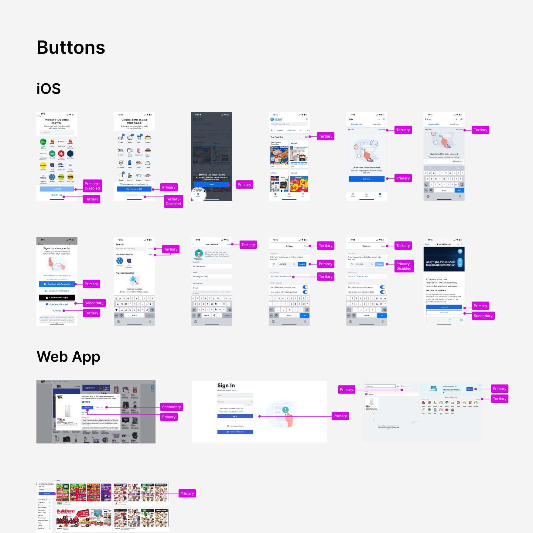 To begin, I conducted a full audit of the existing design components, creating an inventory of every element used across platforms. This inventory included examples of implementation and highlighted inconsistencies and redundancies.