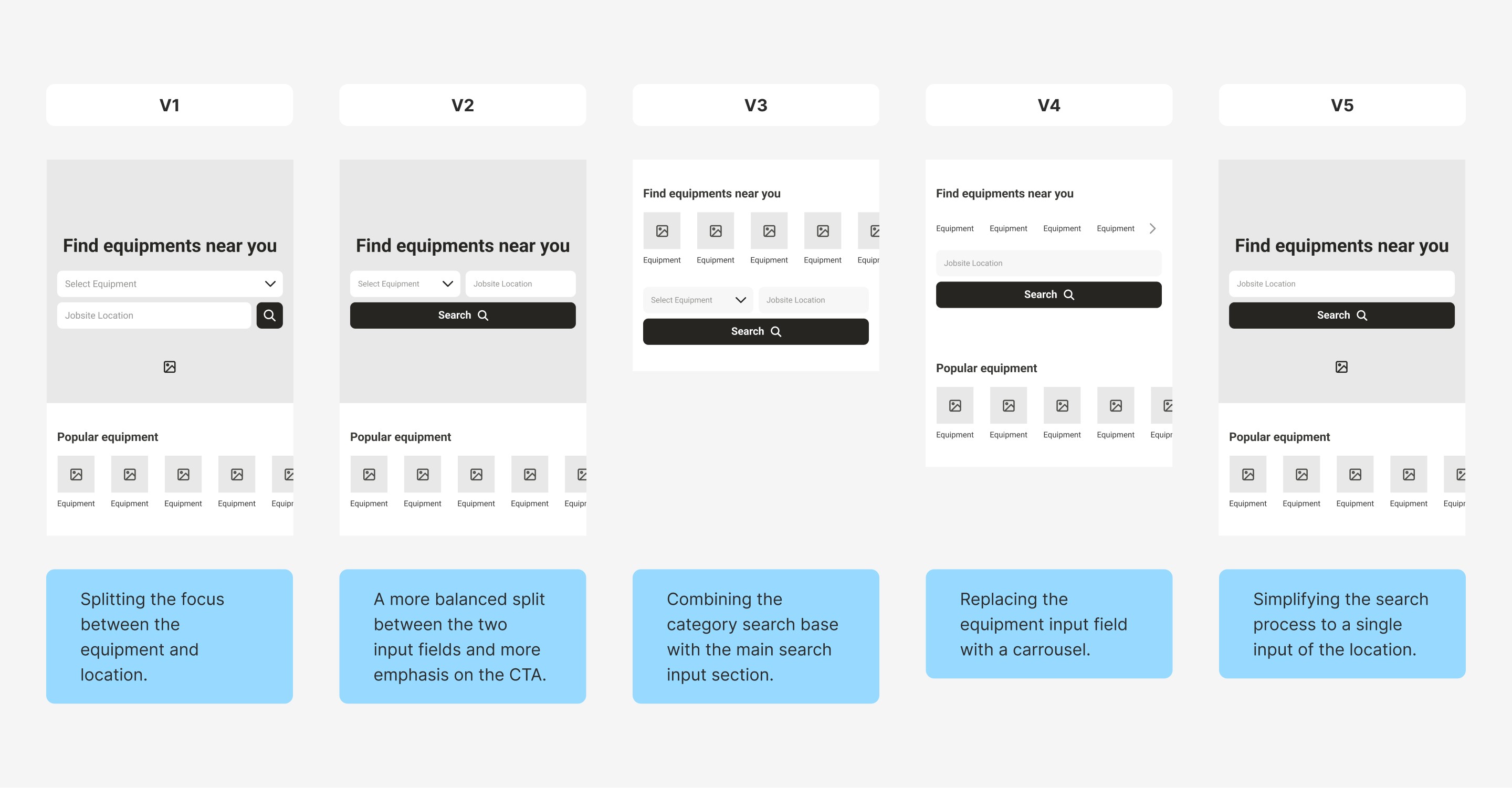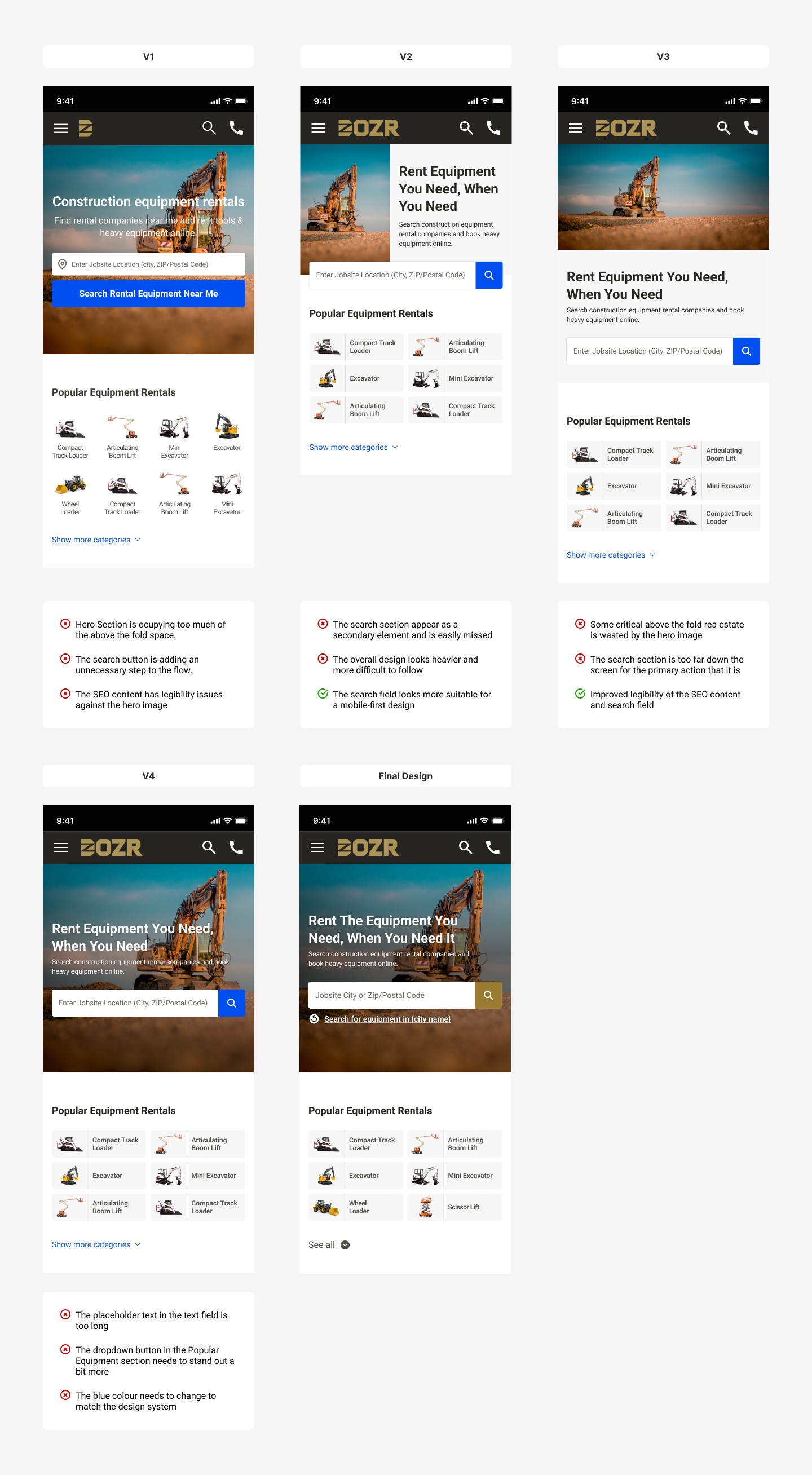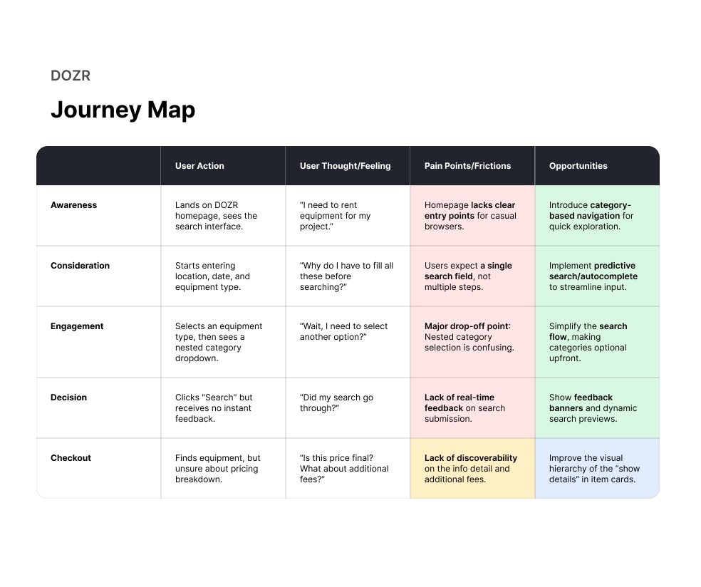 DOZR, a marketplace for construction equipment rentals, faced a major search engagement issue. 2/3 of homepage visitors bounced before completing their search, resulting in lost revenue due to low user engagement and high bounce rates. To fix this, we analyzed user behaviour, identified friction points, and redesigned the homepage to streamline search, reducing drop-off and increasing conversions.